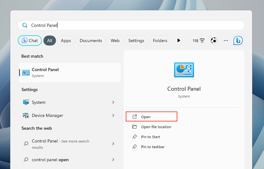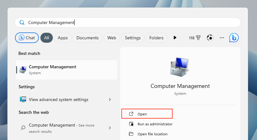 - Open the Start menu, type **Computer Management **into the search box, and select Open.