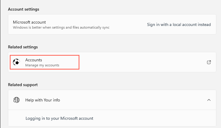 - Select **Accounts – Manage my accounts** under the **Related settings** section. )In Windows 10, select **Manage my Microsoft account**.)
