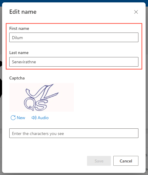 - Enter the new name into the **First name **and **Last name **fields, verify that you’re not a robot, and select **Save**.
