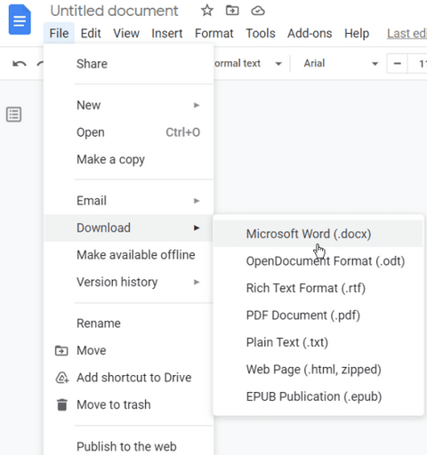 Go to File, then Download, and choose a suitable format, typically it should be docx.