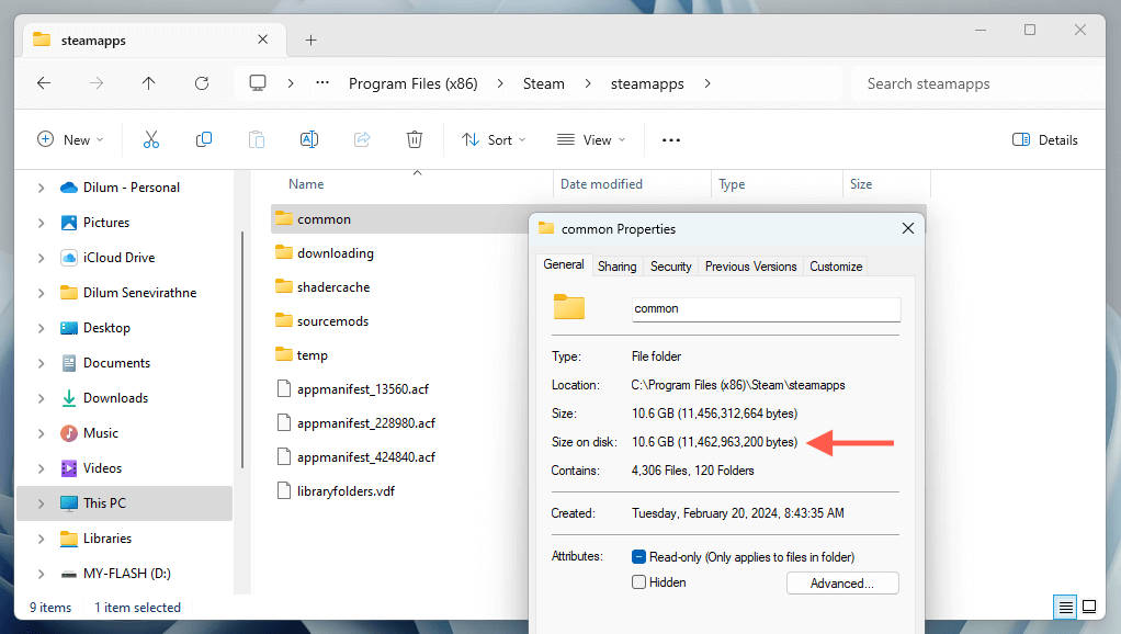 - Go back to the steamapps folder, right-click the common sub-folder, and select Properties to view the size of your entire Steam Library.