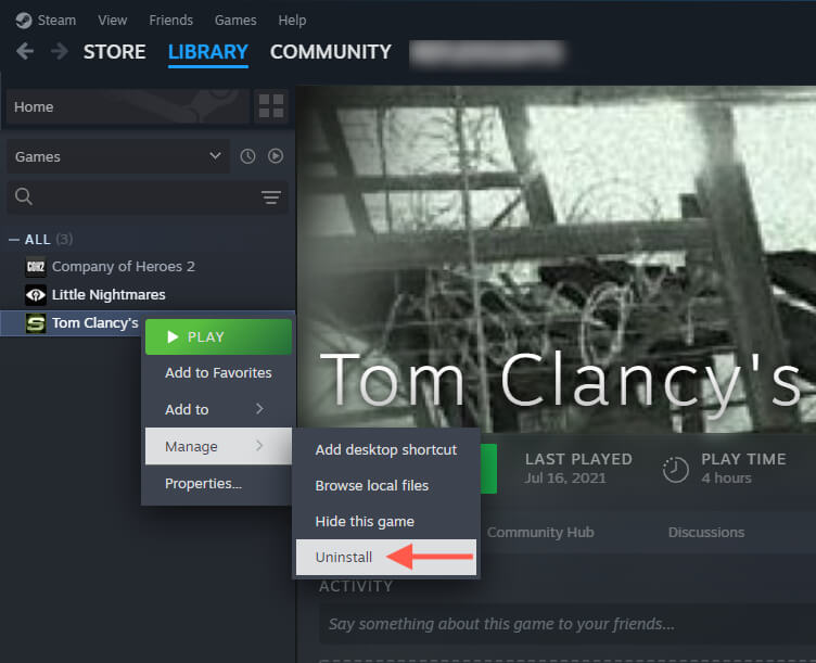 - Right-click the game you wish to delete on the sidebar and select Manage > Uninstall.