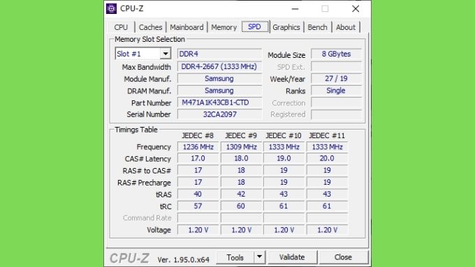Next, switch to the “SPD” tab. This is where the information is displayed as reported by each individual RAM module. If all the modules in your system are identical then you don’t need to switch between them under the “Memory Slot Selection” dropdown.