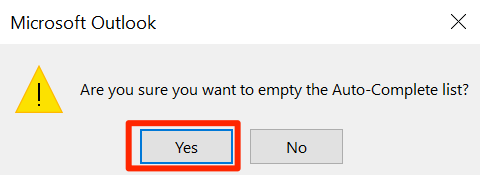 - A prompt will appear on your screen. Click on Yes to get rid of the Outlook auto-complete cache on your computer.