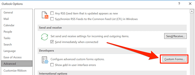 - Scroll down in the right-hand side pane until you see the Developers section. Find the Custom Forms button in this section and click on it to open it.