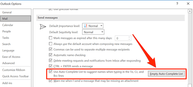 - Various options related to mail will appear on the right-hand side pane. Scroll down in this pane and find the section labeled as Send messages. Then find the option that reads Use Auto-Complete List to suggest names when typing in the To, Cc, and Bcc lines and click on the **Empty Auto-Complete List **button next to it.