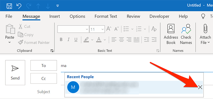 - When the entry appears as a suggestion, hover your mouse over it and you’ll find an X icon next to the entry. Click on this icon and it’ll remove the selected entry from the Outlook cache library.