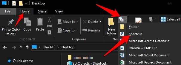 - Select the Home tab and then select New item > Shortcut. Alternatively, right-click on an empty space in the folder and select New item > Shortcut.