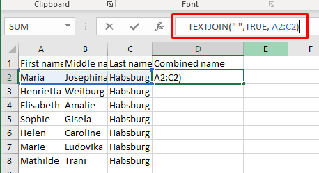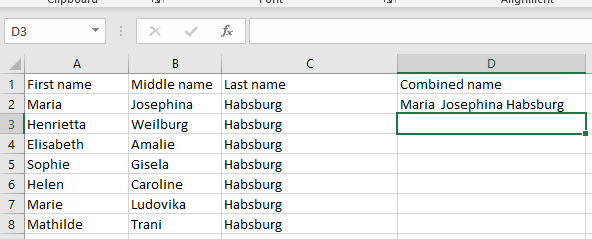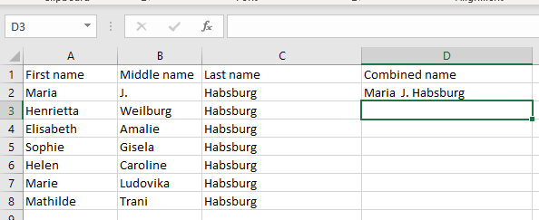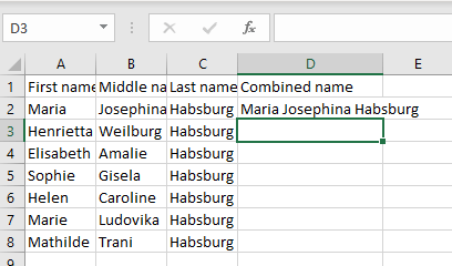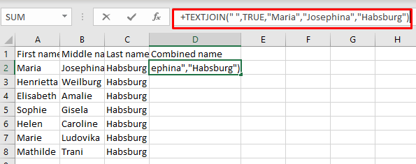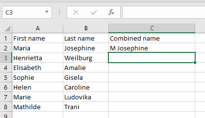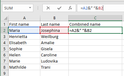 But you wonder why you should bother to type such a complex formula instead of manually filling the full name in the combined column. The answer is you wouldn’t use this formula but an adapted version that is much shorter, and very useful when you have multiple cells. It has a similar shape as the adapted concatenate formula: