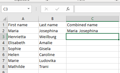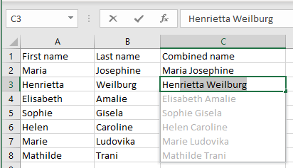 If you want to combine the names from A2 cell and B2 cell, type the full name in C2. Then start typing the full name for the combination from A3 and B3. Excel will recognize the pattern and fill the C column automatically. Press enter to confirm you want Excel to fill all the cells in the C column with the appropriate name combinations.