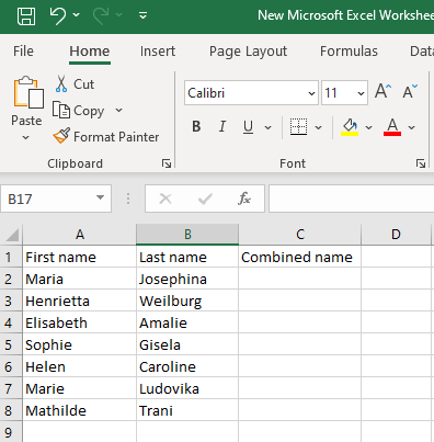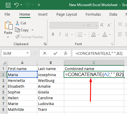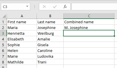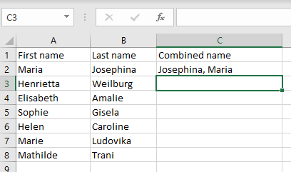 Select the cell in the third column where you’ll create a combined name and type in the following formula: