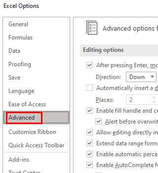 - Select Advanced from the options window.
