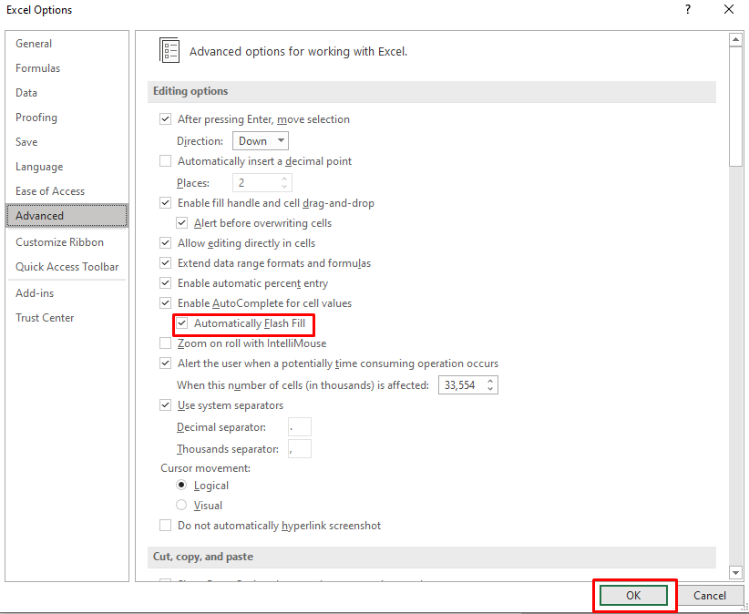 - Check the box next to Automatically Flash Fill, and confirm with the OK button.
