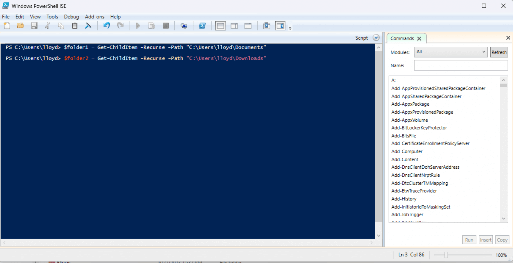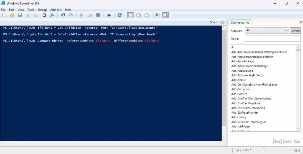 - Repeat this for the second folder, using a different variable. $folder2 = Get-ChildItem -Recurse -Path “C:\Users\lloyd\Downloads”