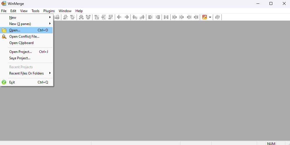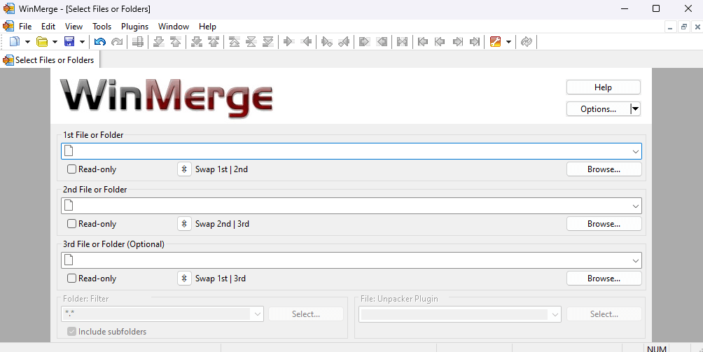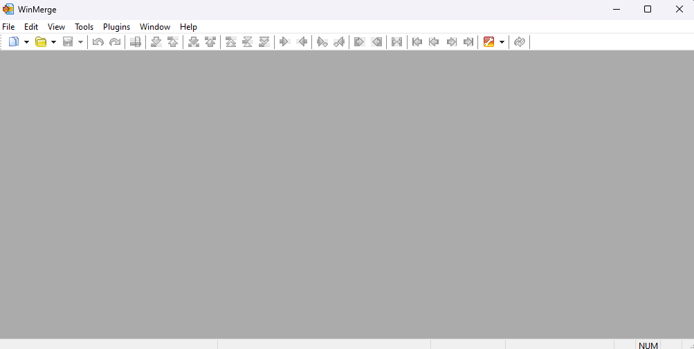 - Launching WinMerge opens a blank window as no folders have been selected yet.