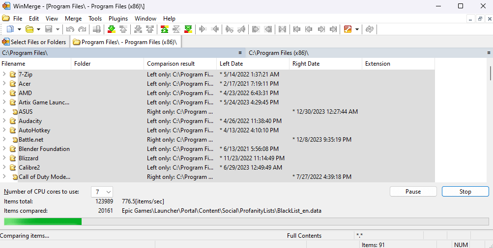 - Hit enter when you are done. WinMerge will now go through the folders you specified, comparing their files and collecting all relevant information.