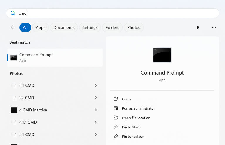 - To compare folders using the terminal, open Command Prompt. Just type cmd in the Start menu and open the app.