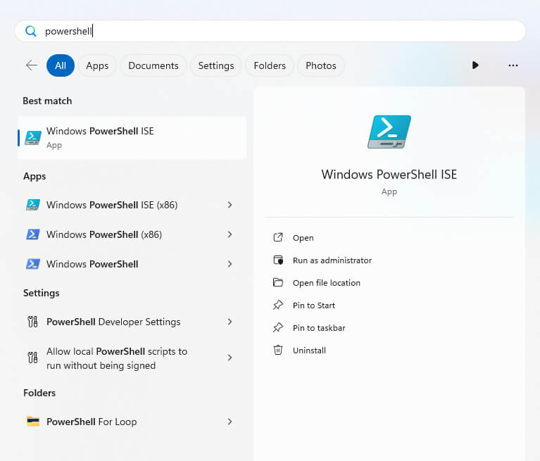 - To start comparing folders with the powerful scripting utility, search for Powershell in the Start Menu and run it. This usually opens the PowerShell Integrated Scripting Environment, or PowerShell ISE as it is named in the menu.