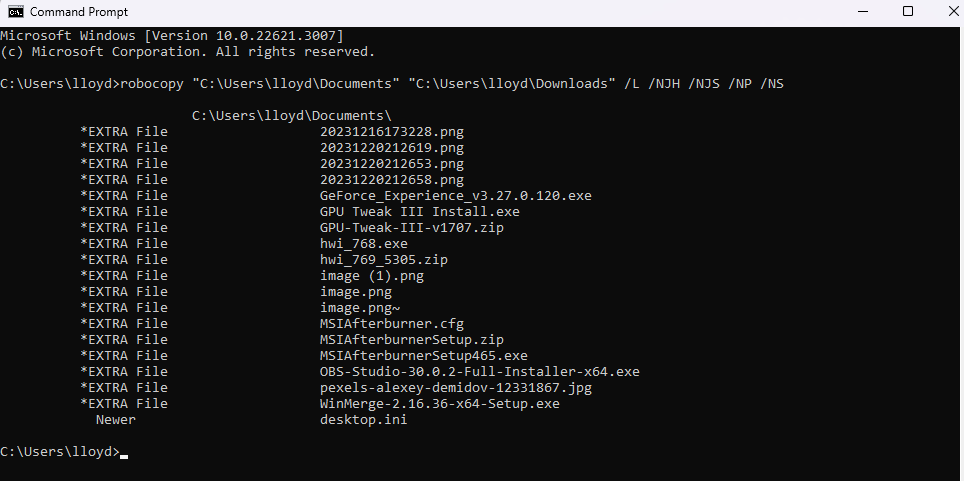 Third-party tools aside, Windows has some utilities for file comparison as well. Unfortunately, they lack a GUI, since we are talking about CMD commands. But if the terminal screen does not daunt you, the robocopy command (and yes, that’s the actual name of the command) can be a powerful tool.