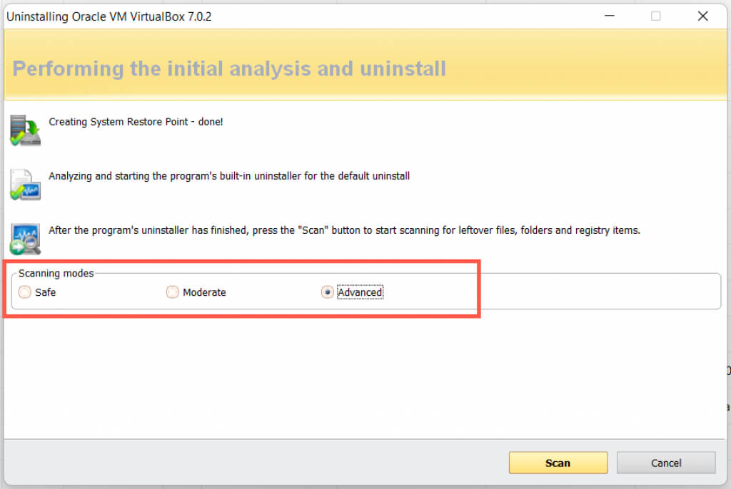 - Pick a scanning mode—Safe, Moderate, or Advanced. Select Safe if you don’t want to risk breaking the operating system.