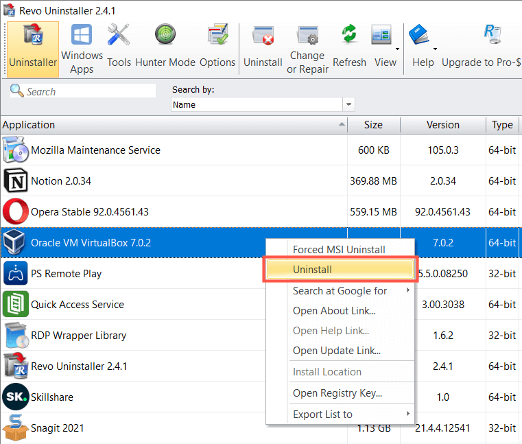- Right-click Oracle VM VirtualBox and select Uninstall.