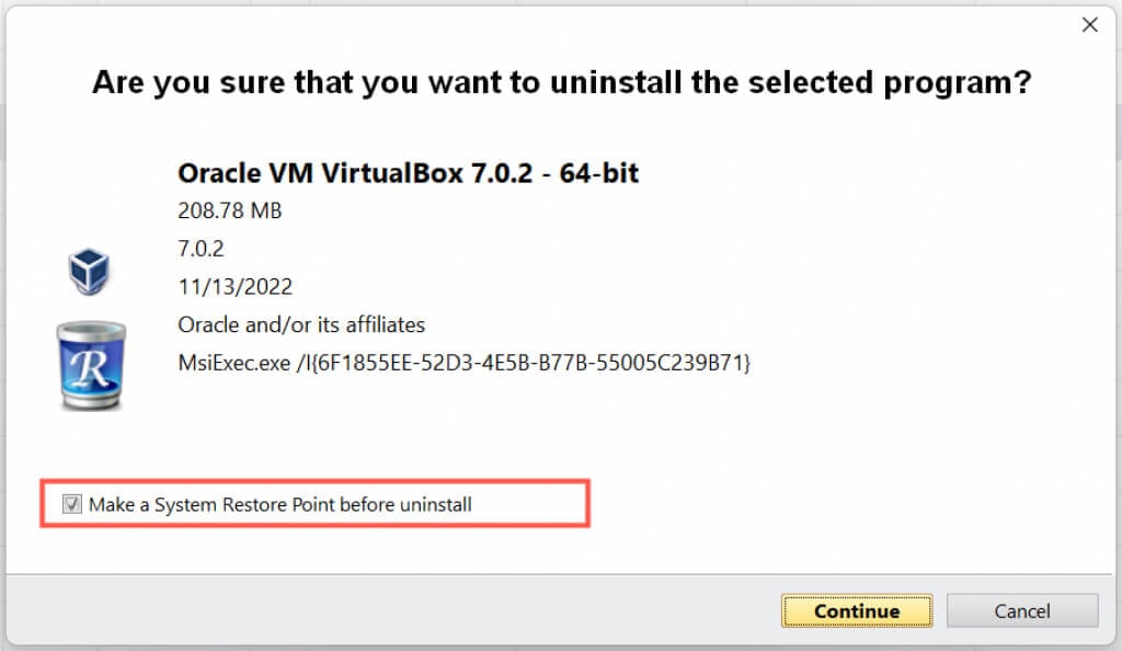 - Enable the Make a System Restore Point before uninstall box and select Continue.