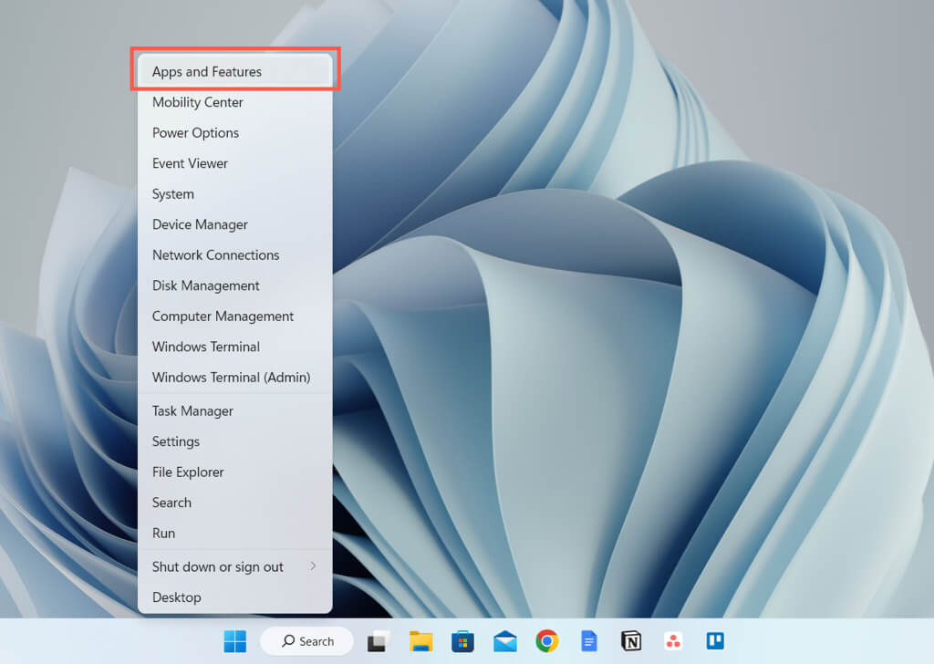 - * Right-click the Start button and select Apps and Features.