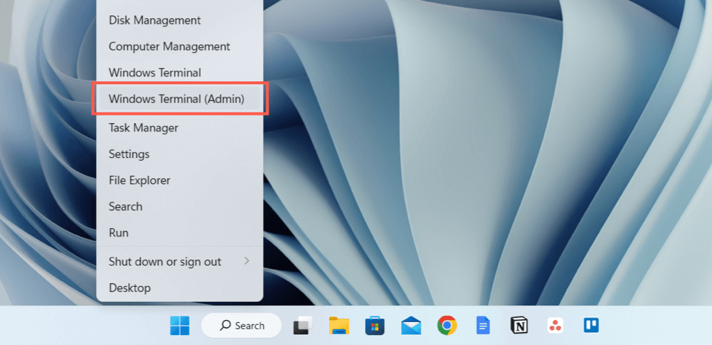 - Right-click the Start button, choose Windows PowerShell/Terminal (Admin).