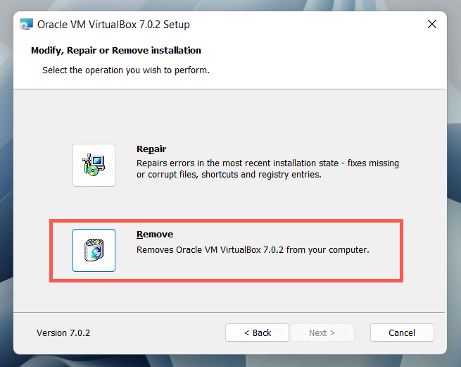 If VirtualBox doesn’t appear within the Settings app or the Control Panel, use the Virtualbox installer to remove the program.