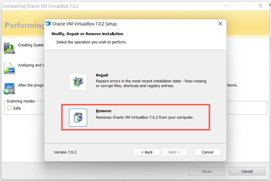 - Select Remove on the VirtualBox uninstaller.