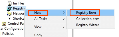 - Right-click on **Registry **and select **New **> **Registry Item**. We’ll create 5 registry keys with this part of the process. We’ll go through the first one. Repeat the steps accordingly for the other 4 registry keys with the properties provided below.