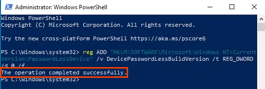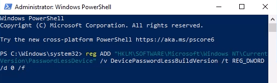 Enter the command reg ADD “HKLMSOFTWAREMicrosoftWindows NTCurrentVersionPasswordLessDevice” /v DevicePasswordLessBuildVersion /t REG_DWORD /d 0 /f and press Enter.