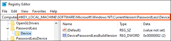 - When the Registry Editor window opens, navigate to **HKEY_LOCAL_MACHINE** > **SOFTWARE** > **Microsoft** > **Windows NT** > **CurrentVersion** > **PasswordLess** > **Device**.