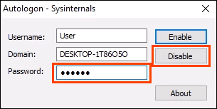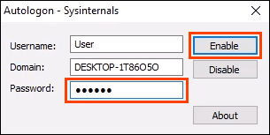 - Autologon will already be filled in with the **Username **and **Domain**. Enter the **Password** for the user and select **Enable**.