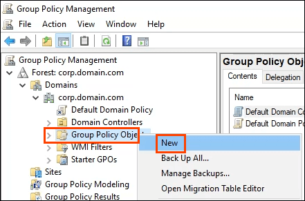 - On the domain controller, open Group Policy Management and navigate to **Domains **> **YourDomain **> Group Policy Objects. Once there, right-click on Group Policy Objects and select New.