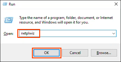 - Type netplwiz and press Enter. The User Accounts window will open.