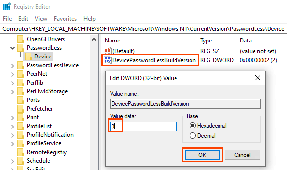 - Double-click on the **DevicePasswordLessBuildVersion** key and change the **Value data** from **2** to **0**. Select **OK**.
