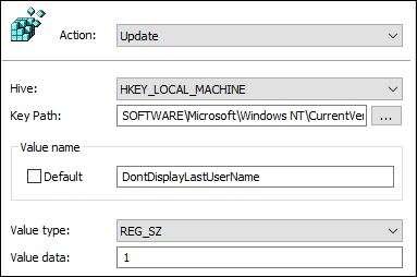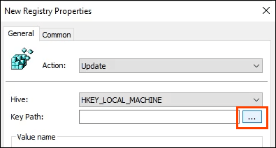 - In **New Registry Properties**, leave **Action **as **Update **and **Hive **as **HKEY_LOCAL_MACHINE **(HKLM). Select the ellipses or three-dots (…) next to the **Key Path **field. The **Registry Item Browser **window opens.