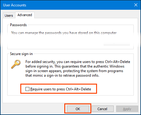 Once we’re back in the User Accounts window, select the **Advanced **tab. Find **Require users to press Ctrl + Alt + Delete to login **and make sure it’s unchecked. Select **OK **and on the next login, Windows won’t ask for a password.
