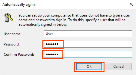 - The **Automatically sign in **window will open, pre-filled with the user name. Enter the **Password **and **Confirm Password**.