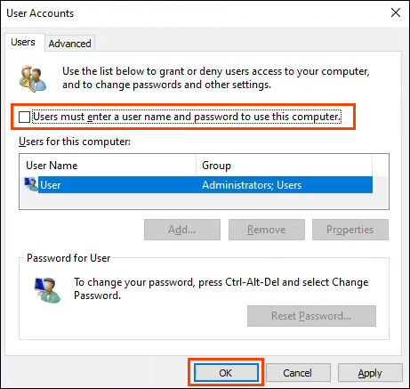 - Uncheck the box that reads **Users must enter a user name and password to use this computer**. Select **OK**.