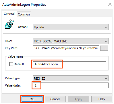 - Back in the **New Registry Properties **window, enter **AutoAdminLogon **in the **Value Name **field. Leave **Value type **defaulted to **REG_SZ **and enter **1 **in the **Value data **field. The 1 means enable AutoAdminLogon. If we wanted to disable it, we’d change that to zero (0). Select **OK **to set the registry setting in the GPO.