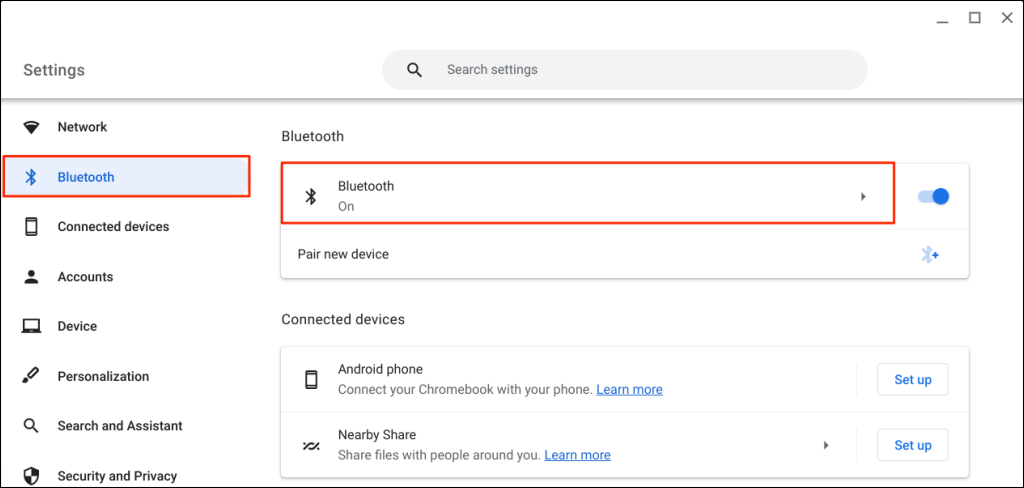 - Open the Settings app, select Bluetooth on the sidebar, and select Bluetooth again.