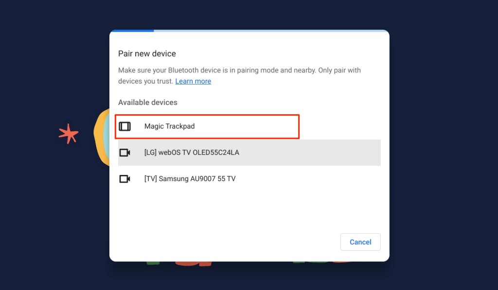 - Put your Bluetooth mouse in pairing mode and wait for it to appear on the device list. Select your wireless mouse to connect it to your Chromebook.