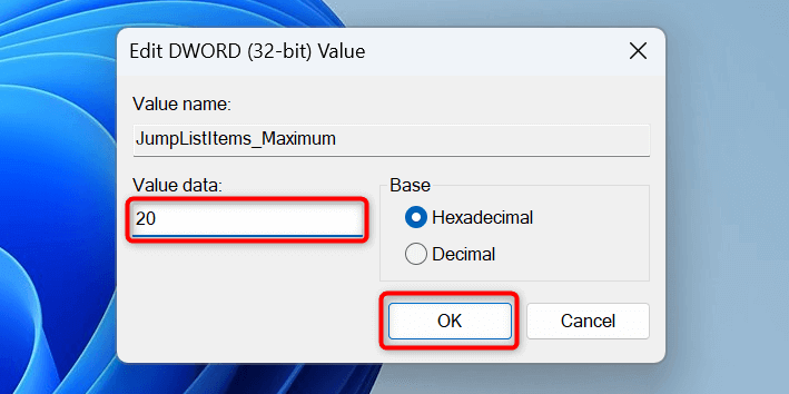 - Double-click the newly-created entry, type the number of items jump lists can have, and select OK.