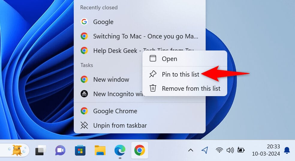 To stick specific items on jump lists, simply pin them to these lists. This way, even if you don’t access those items frequently, the jump lists will still display them. If you’ve already pinned items to your app’s jump list, it’s possible to unpin those items if you want.