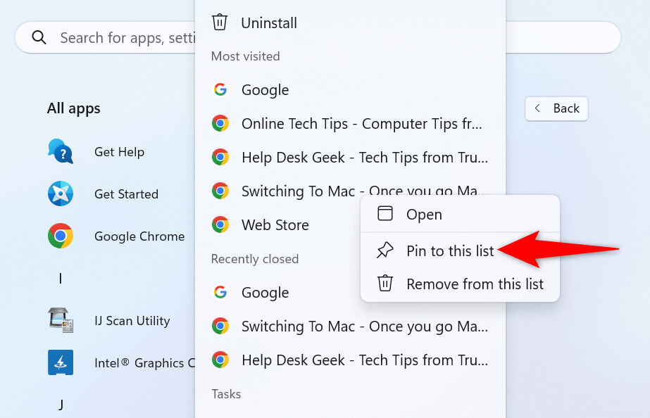 - Find and right-click the app whose jump list you want to edit. * To pin an item to the list, right-click that item and select Pin to this list.
