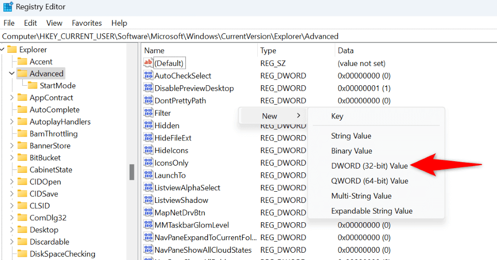 - Select Yes in the User Account Control prompt. * Navigate to the following path in Registry Editor: ComputerHKEY_CURRENT_USERSoftwareMicrosoftWindowsCurrentVersionExplorerAdvanced * Right-click anywhere blank on the right pane and choose New > DWORD (32-bit) Value.