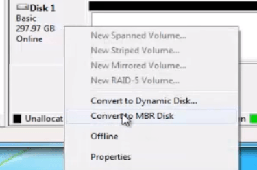 Do this for all partitions. Once finished, right-click the disk and select Convert to MBR Disk.