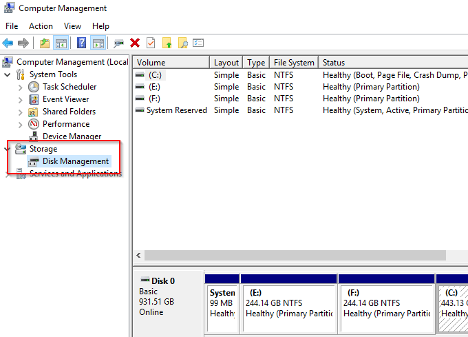 After Computer Management opens, go to the left-hand sidebar. Under Storage, select Disk Management.